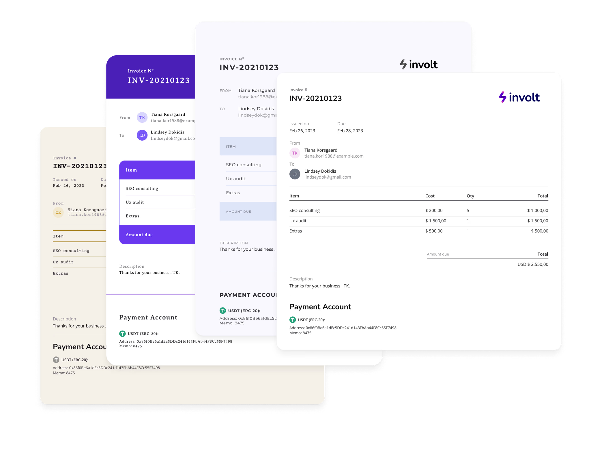 Involt allows users to create and send invoices in USD or local currency, automate recurring payments, and generate export-ready PDF documents — all tailored to the needs of the gig economy. The product integrates with local compliance rules and allows users to track payments, organize clients, and work cross-border with ease.
